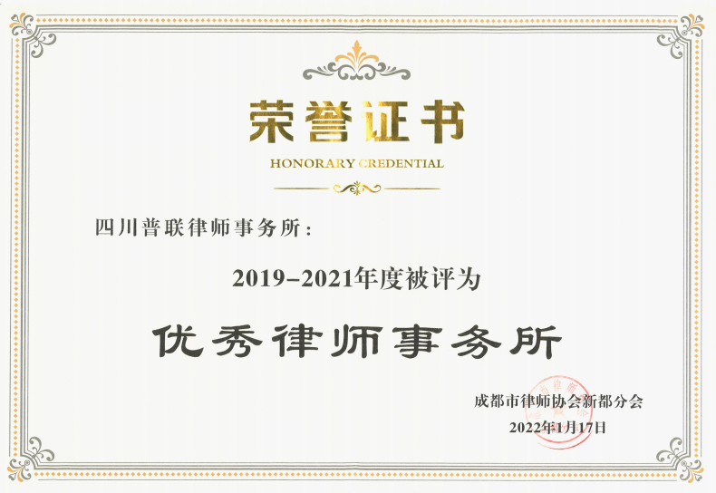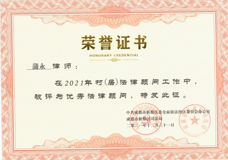 2022年1月12日,普联所主任蒲永律师被中共成都市新都区委全面依法治区委会办公室和成都市新都区司法局表彰为2021年度驻村(居)优秀法律顾问