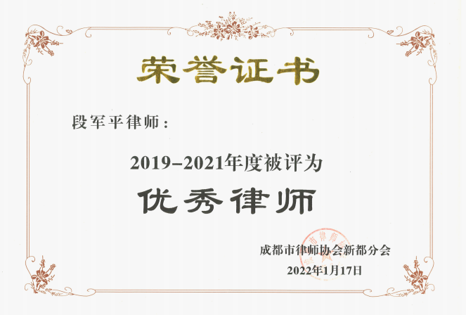 段军平律师被表彰为2019-2021优秀律师