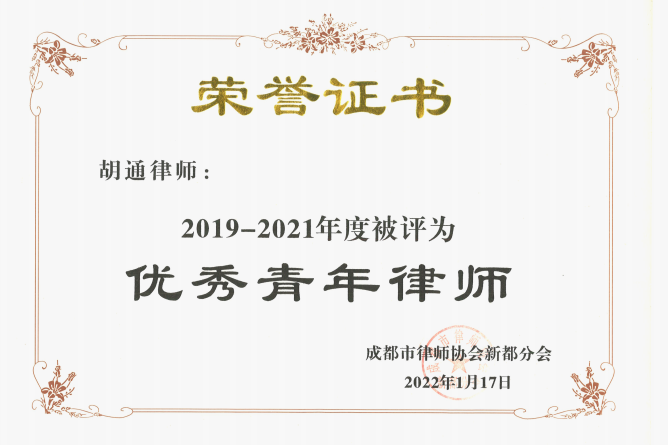 胡通律师被表彰为2019-2021优秀青年律师。